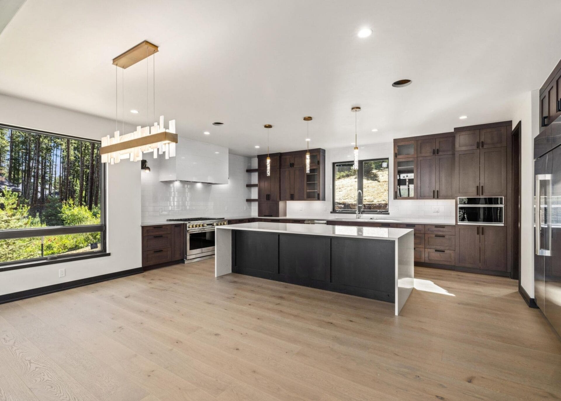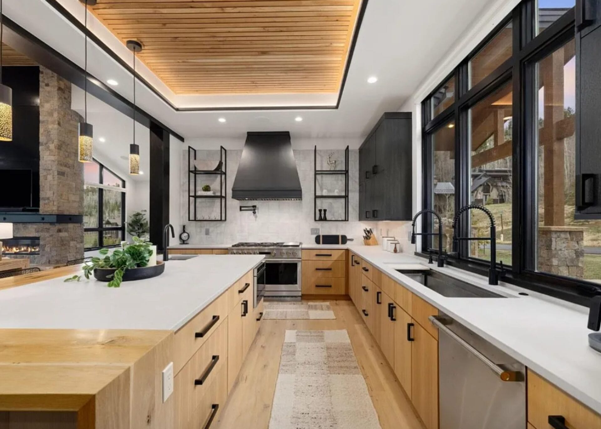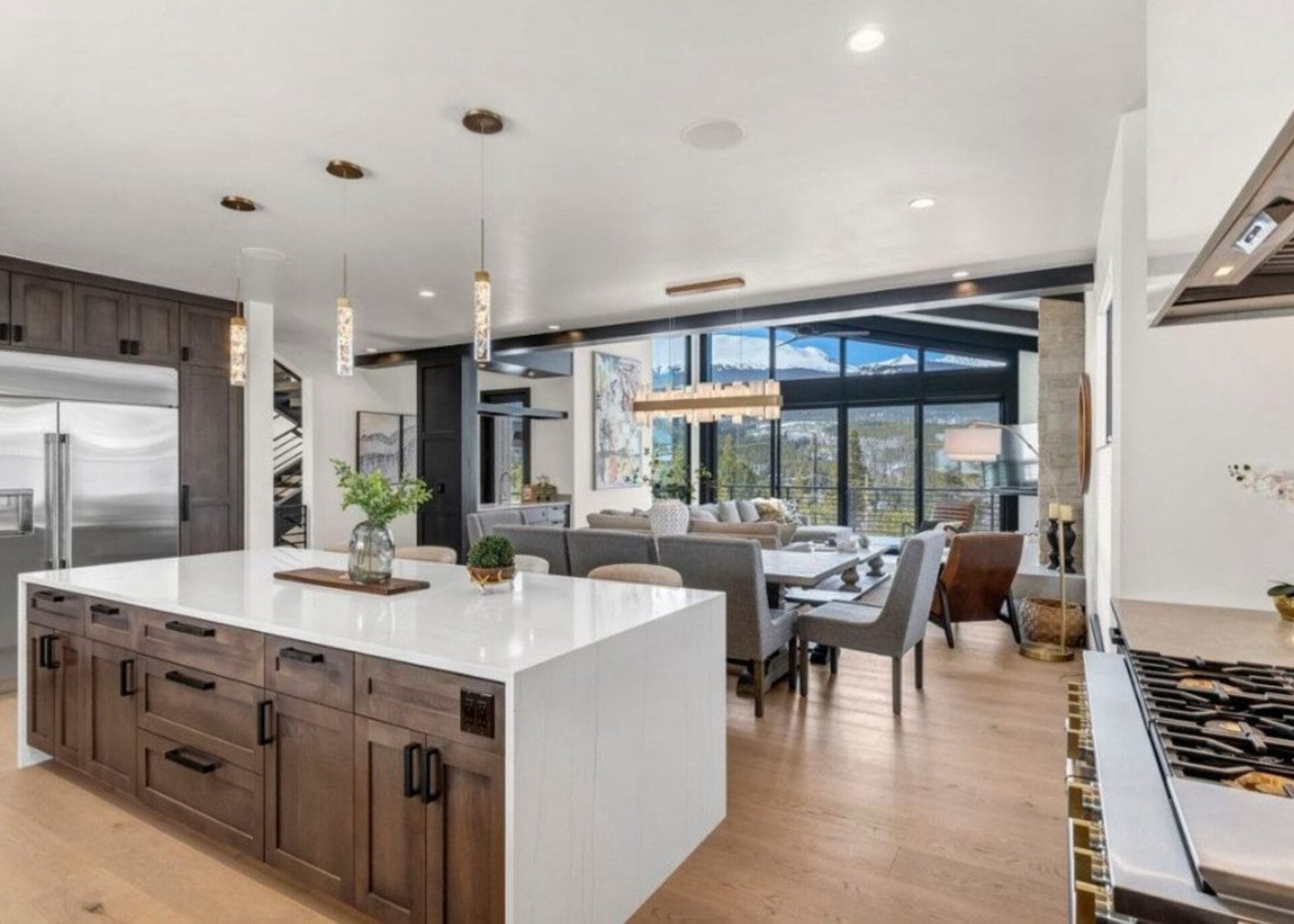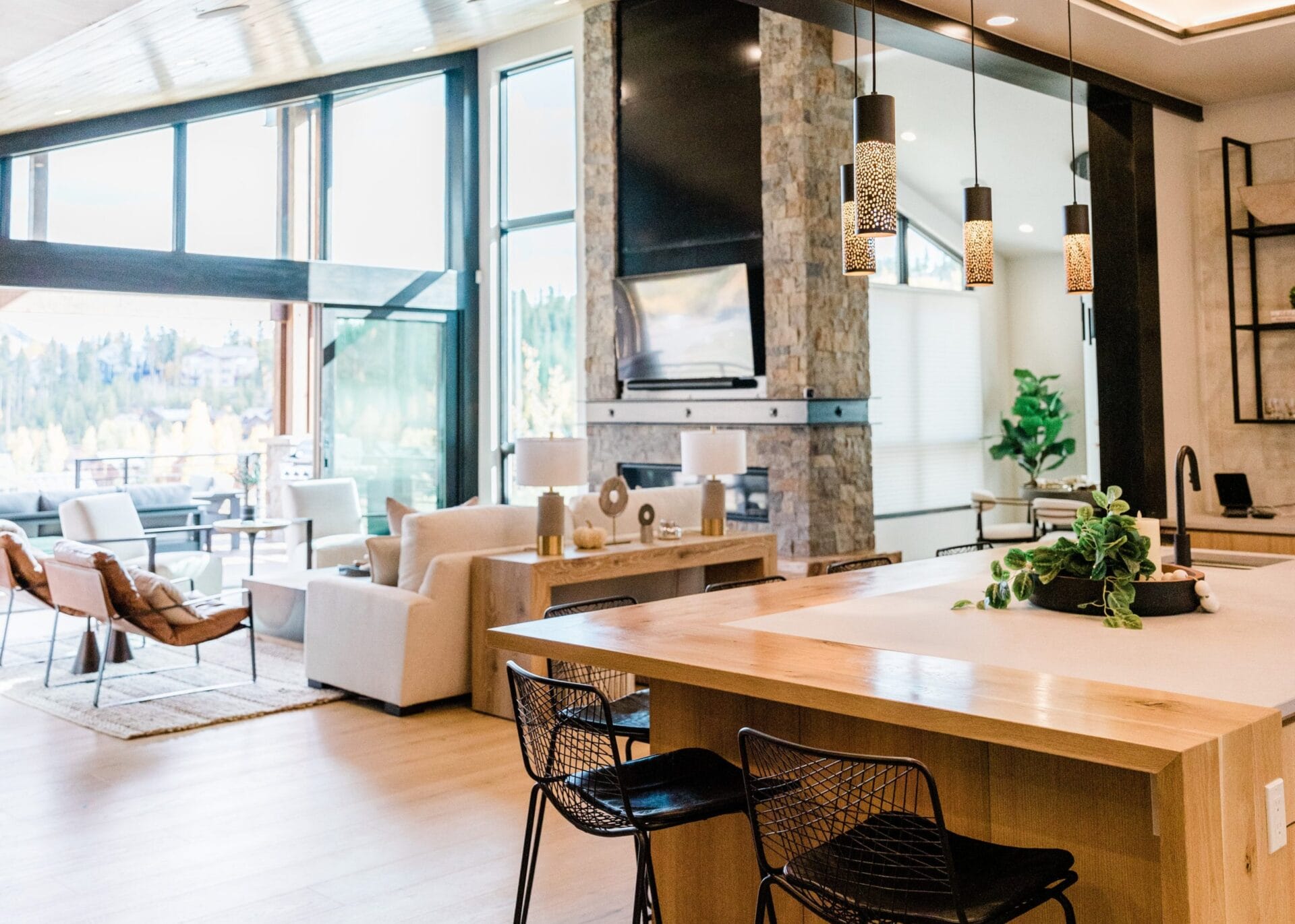 Mountain luxury: open living, gourmet kitchen, nature-inspired details.