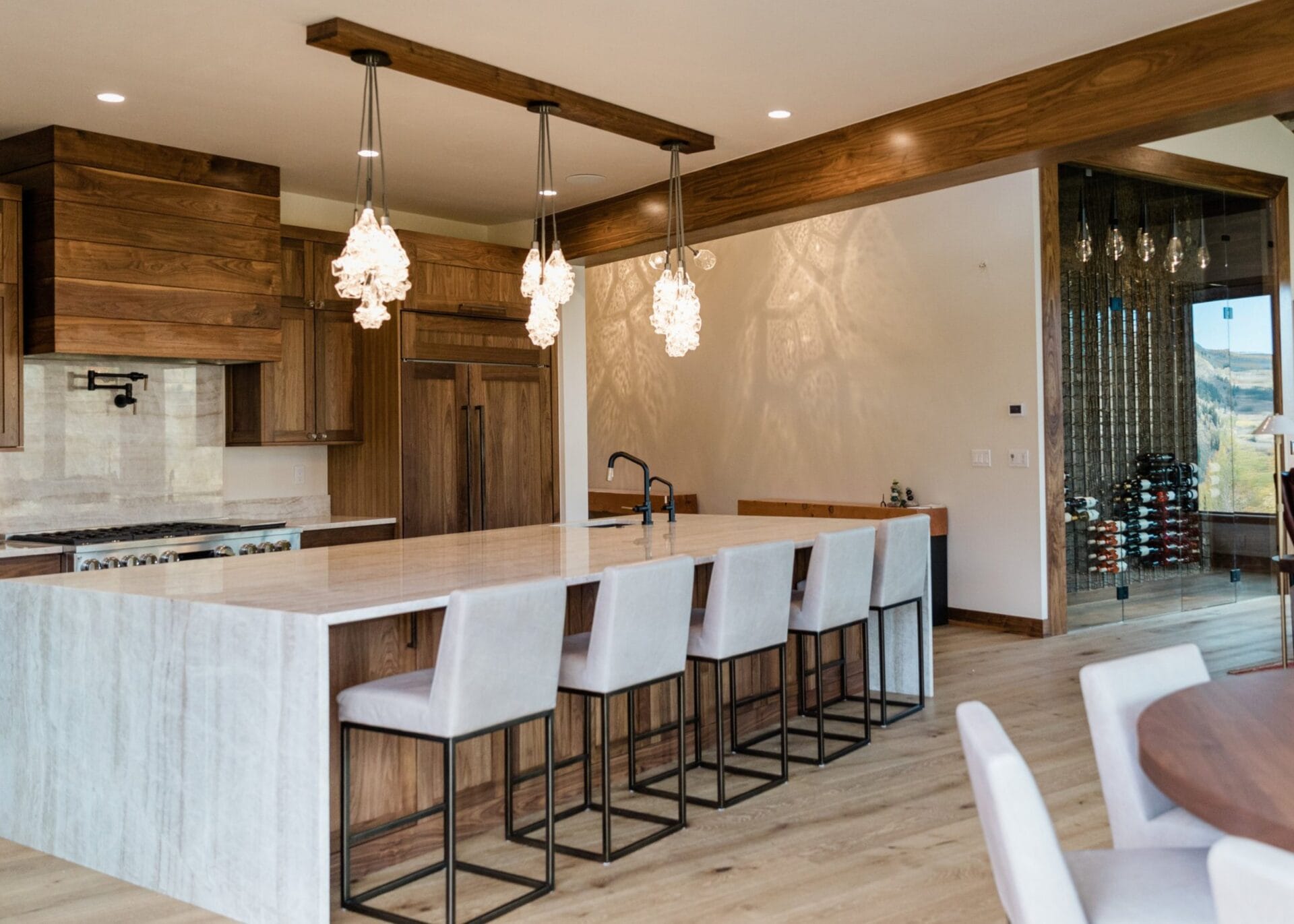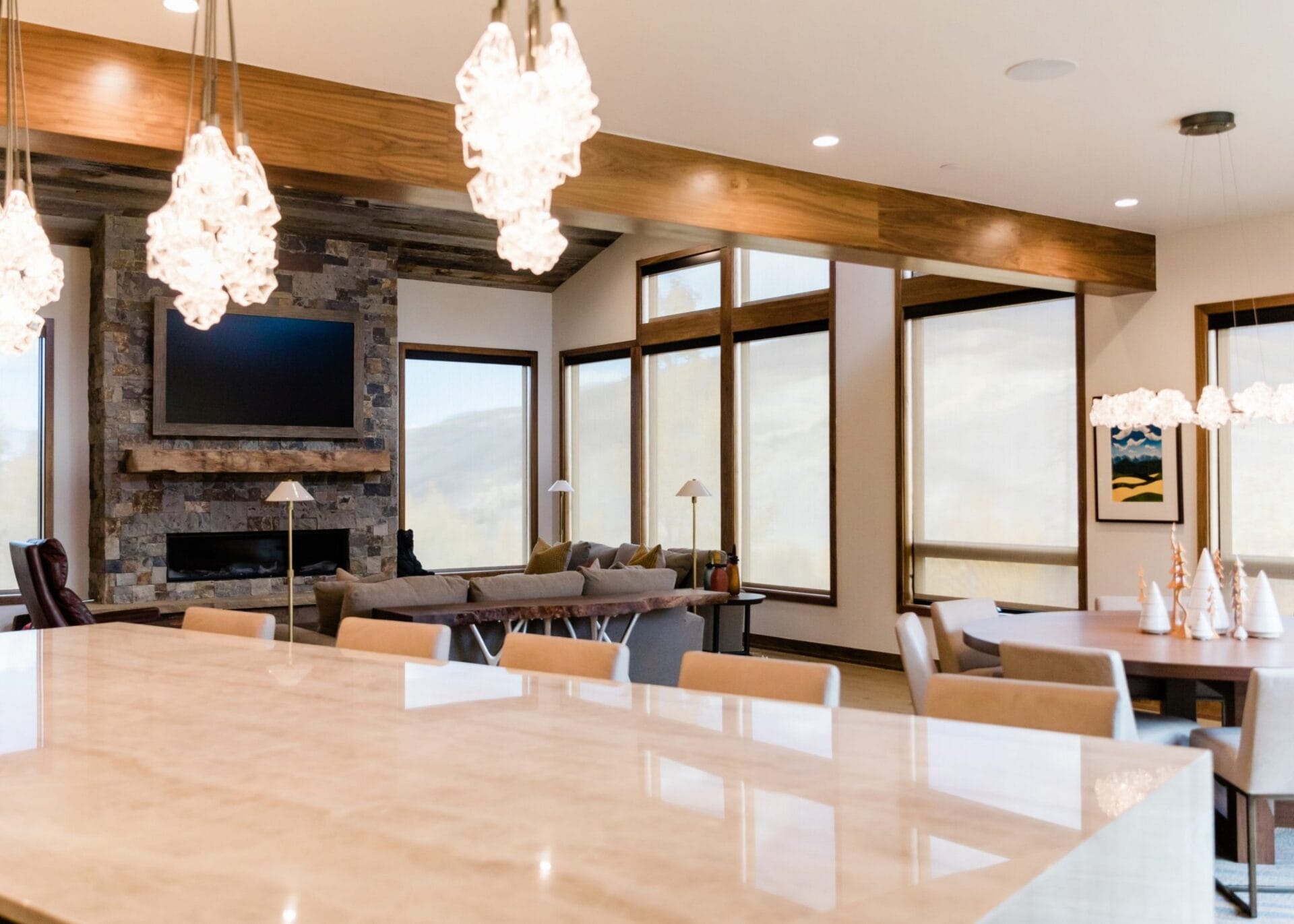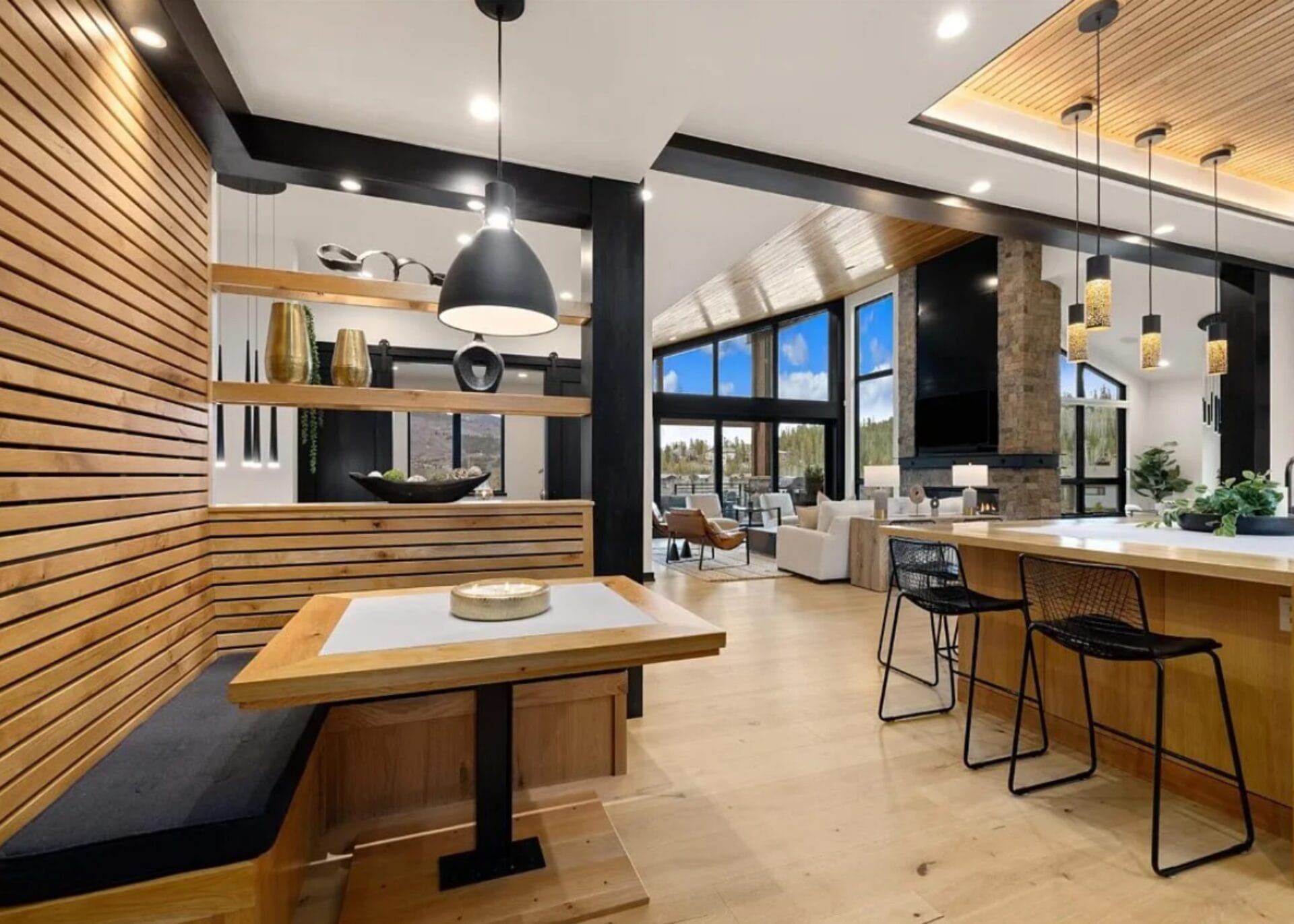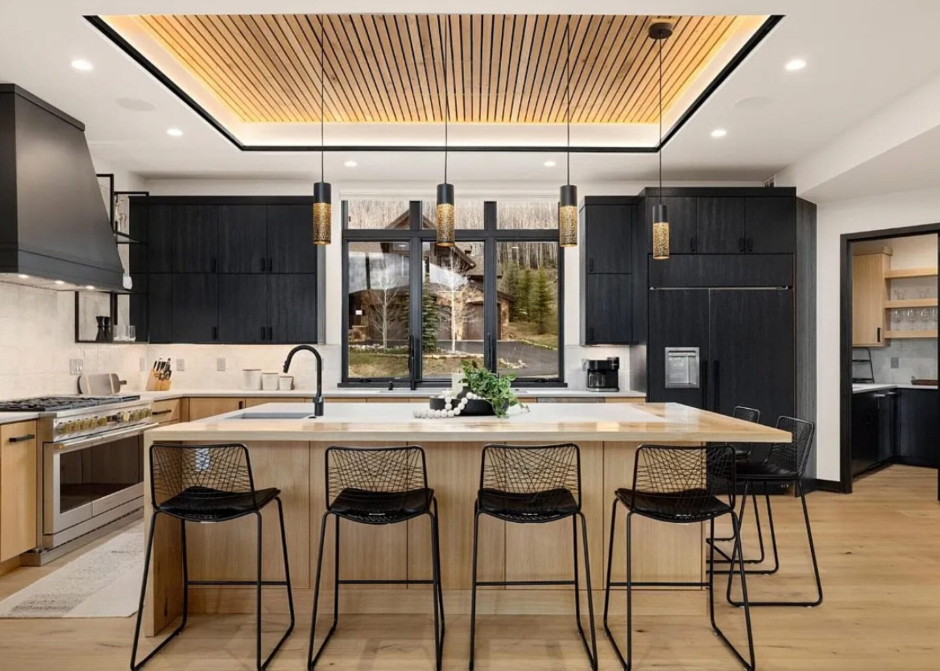 Mountain luxury: open living, gourmet kitchen, nature-inspired details.
