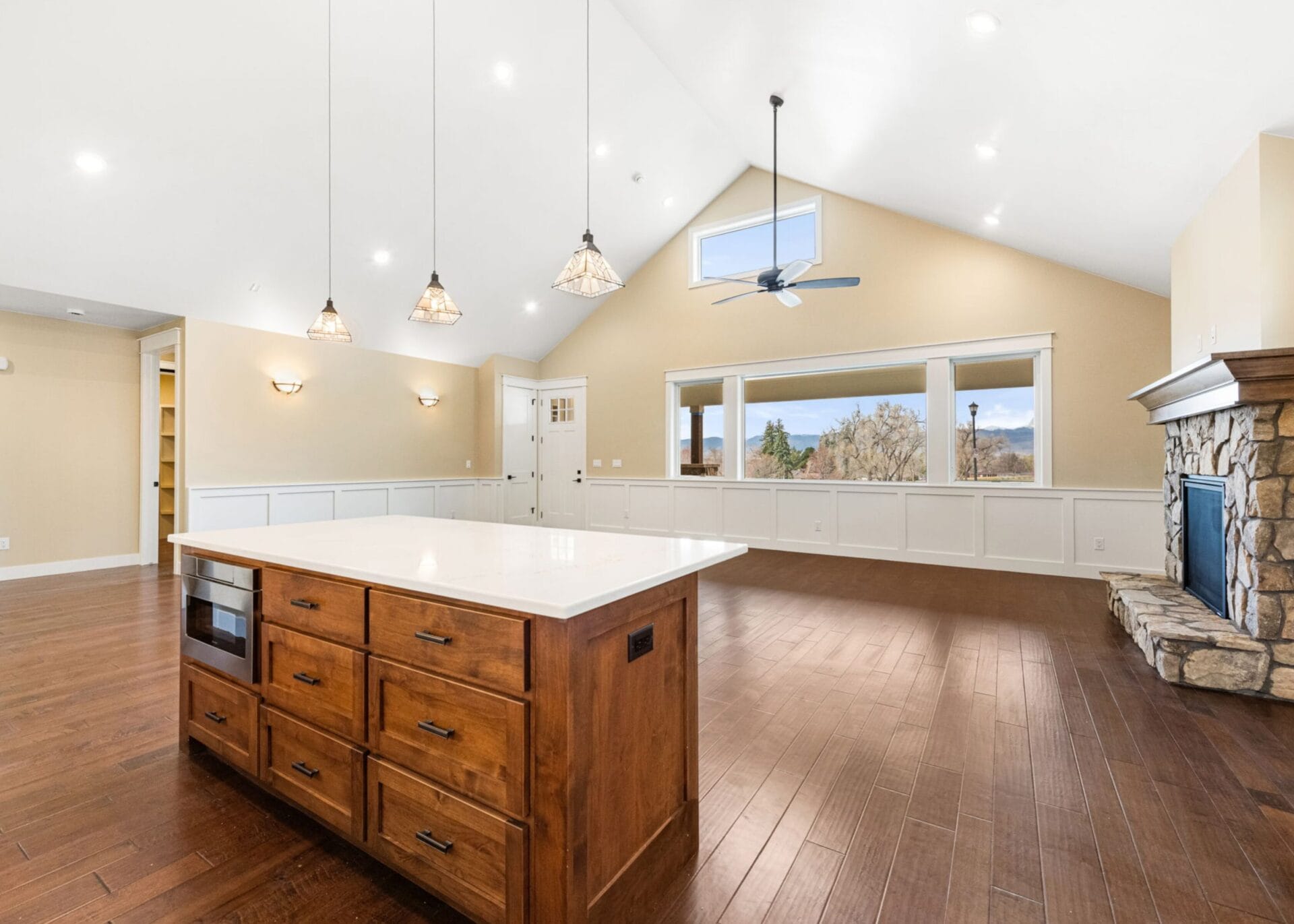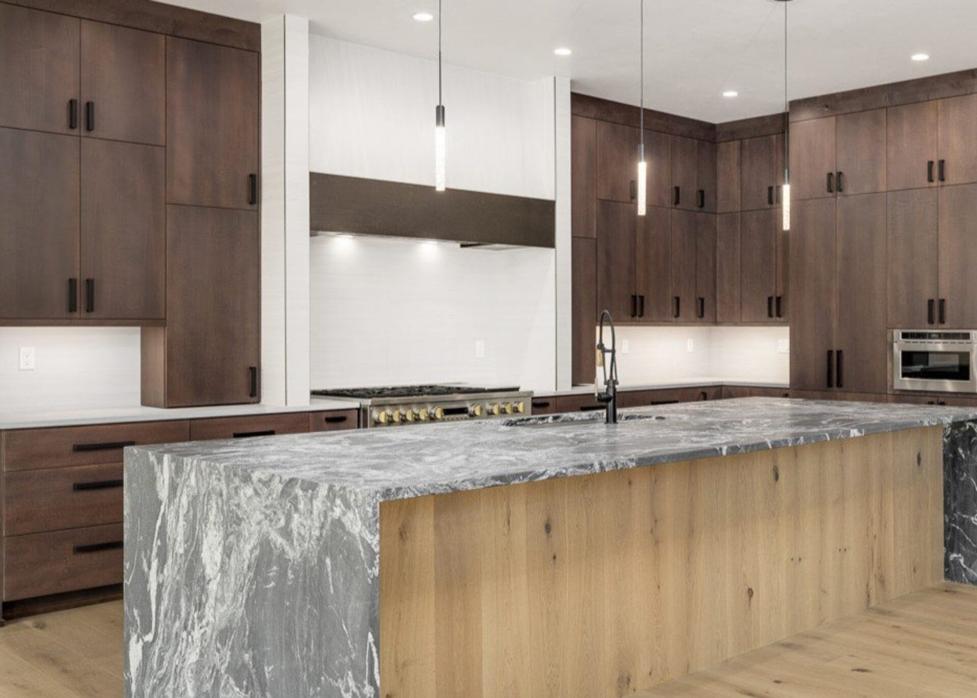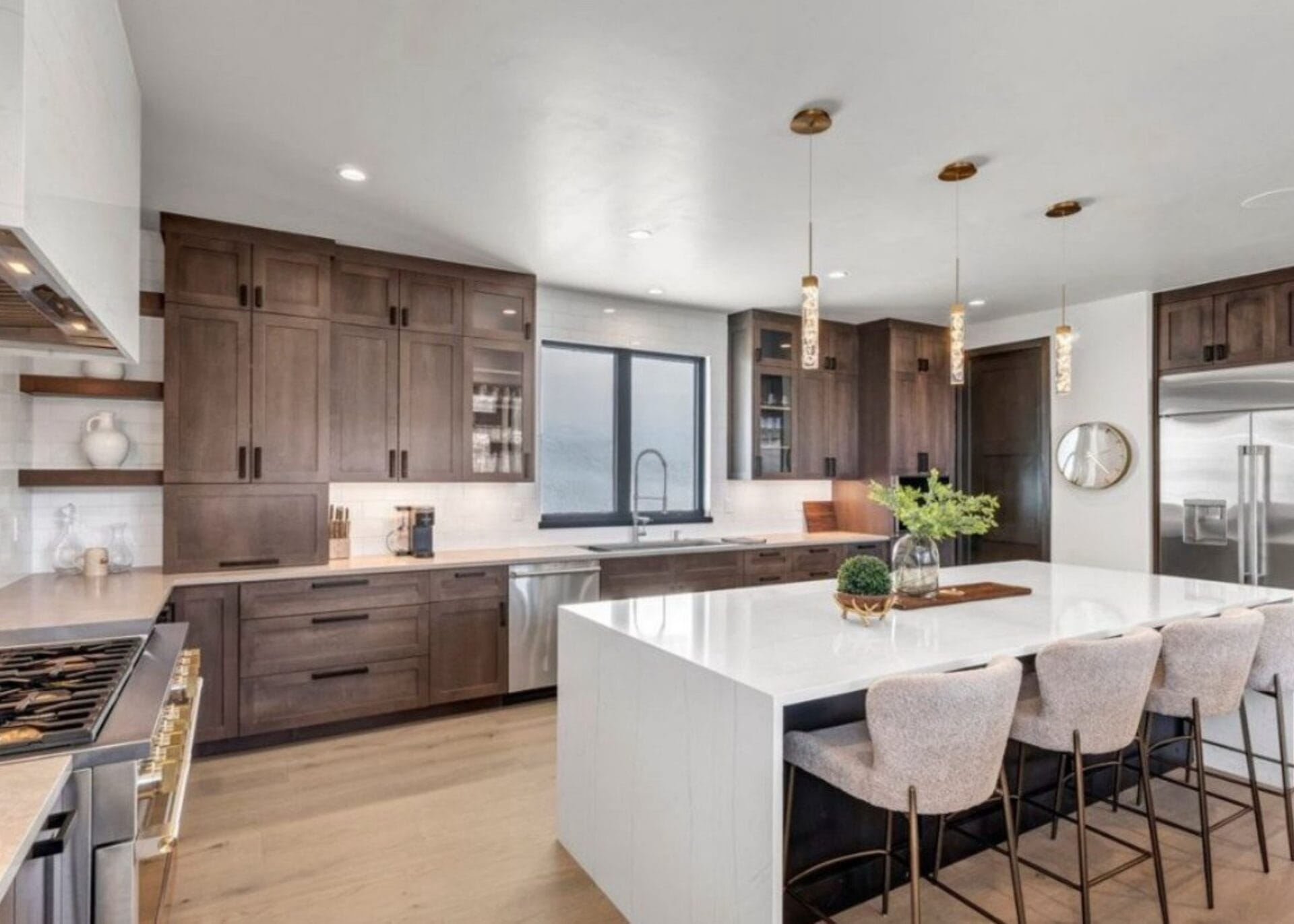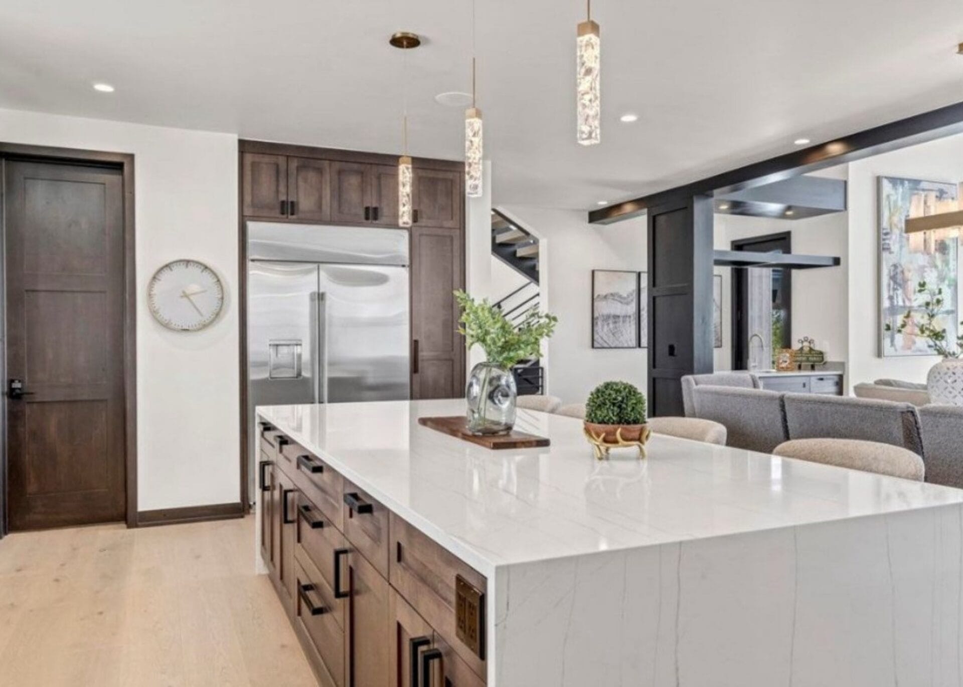 Mountain luxury: open living, gourmet kitchen, nature-inspired details.