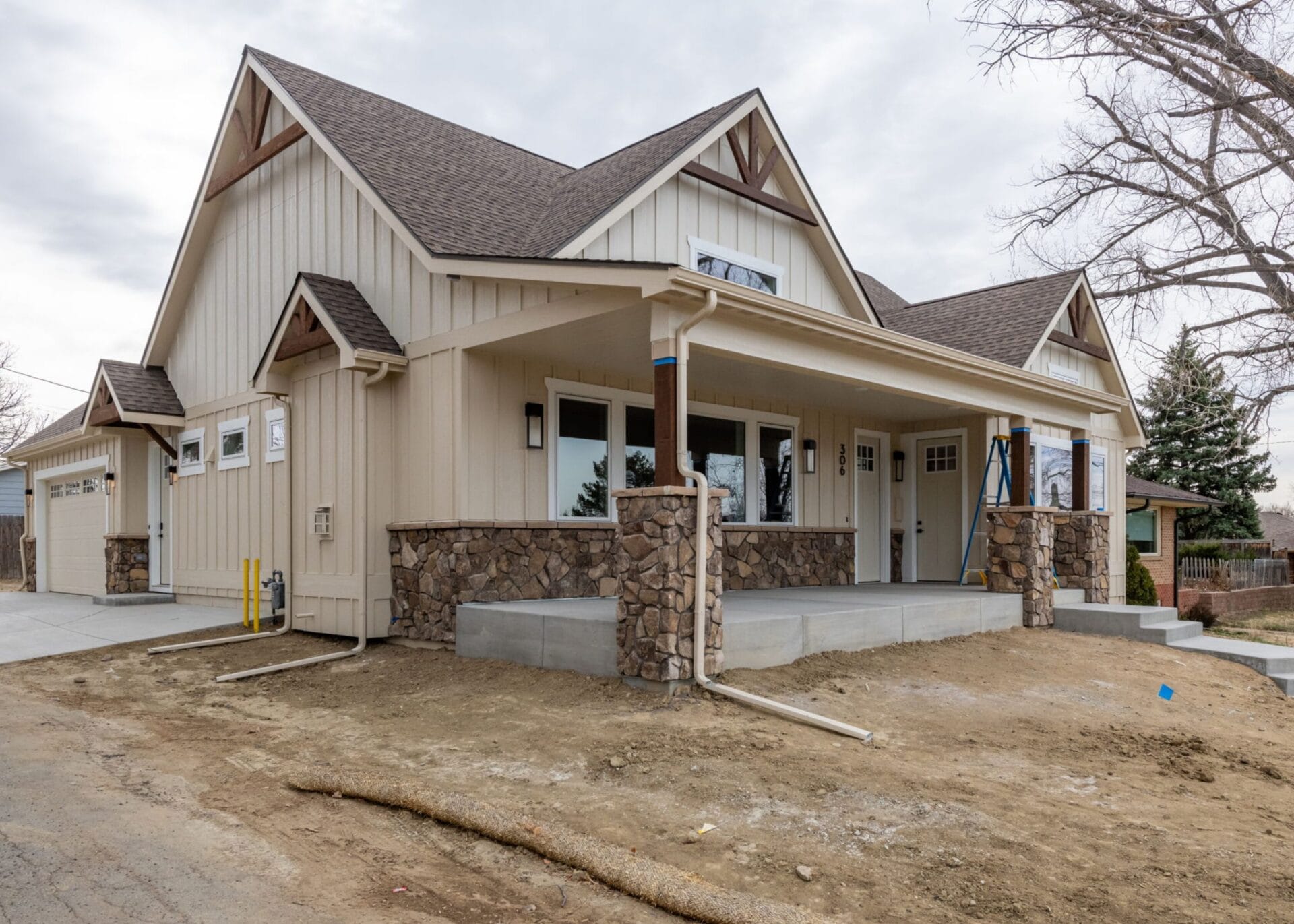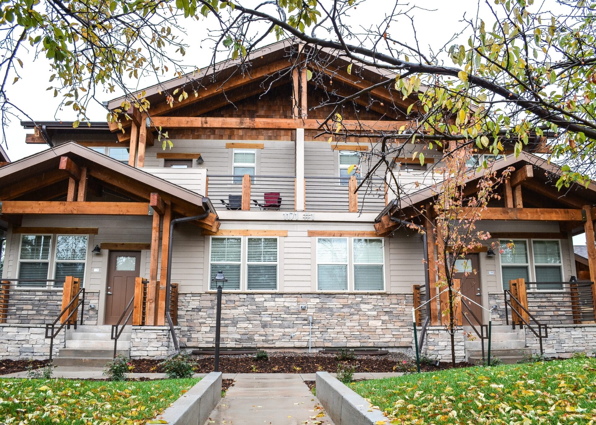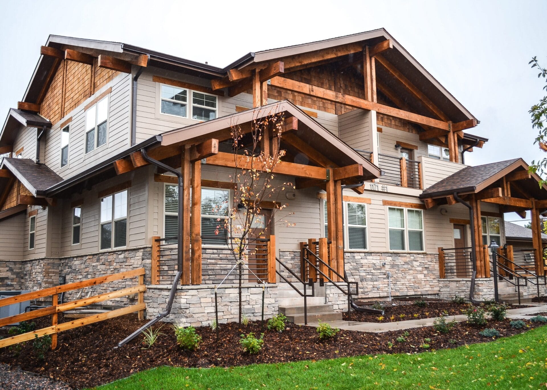 Craftsman-style Longmont triplex: timber accents, stone bases, balconies,